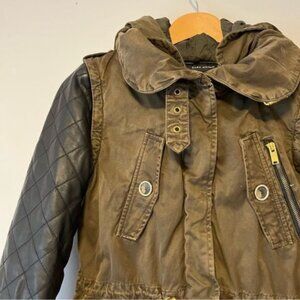 Zara women olive green winter jacket with faux leather quilted sleeves small size and hood. Removable insert of faux sheep skin so this can easily convertible to a spring jacket.