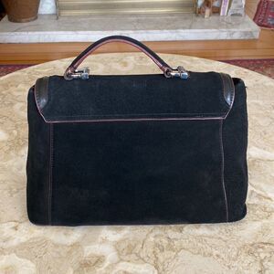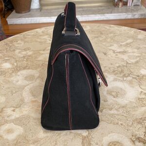 Gorgeous Zara satchel style bag, elegant black suede, contrasting piping and a bold silver tone closure. Single handle, clean lined interior, this bag is quite roomy. It is in fabulous condition but please note a small part of the piping at the base of the handle is missing (see last two photos)