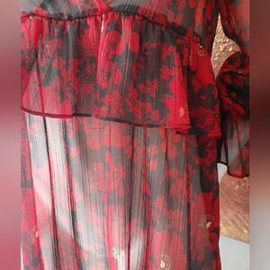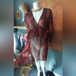 romantic and demure dark Floral ruffled chiffon mini dress from Zara. sheer, will need a slip! long sleeves with elastic ruffled cuffs. v neck with ruffled elastic empire waistline. metallic thread detailing throughout. label and material tags were removed but this is a size small and is polyester chiffon fabric. perfect for a flirty night out!