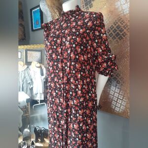 Elegant floral maxi dress from Zara featuring a blend of black and red hues. Perfect for any occasion. 100% viscose with ruffle detailing at shoulders and elastic shirring at cuffs and neck. Only worn once, perfect condition. Double button closure at back with keyhole cut out detail. Dark autumnal floral pattern. Size small, billowy and flowy, see flat lay measurements below!