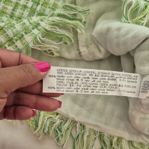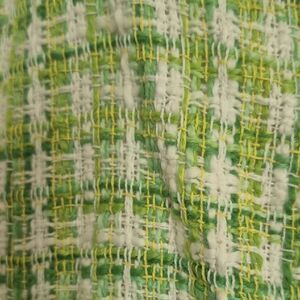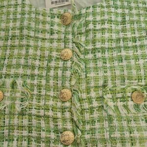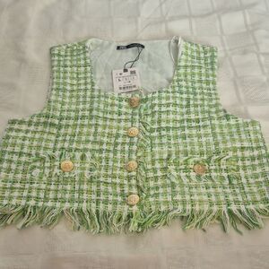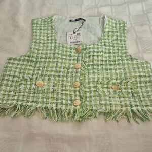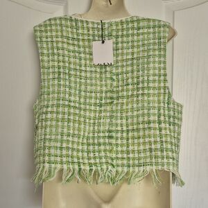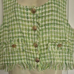 Elegant tweed blouse with button accents. Features a sleeveless design and fringe hem.