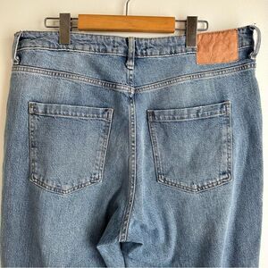 In excellent condition. Zara Straight Leg, distressed jeans. High waisted with rips in both knees. Split seams and frayed hem. Flat lay measurements: 17" waist, 12" rise, 29" inseam