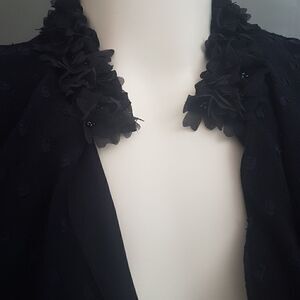 Gorgeous and delicate Zara mini dress. Beautiful flower and beaded applique around neckline and sleeves. Swiss dot pattern. Only worn once, to a wedding. Can be dressed up or down. Lined, very unique almost muted indigo color. Very flapper chic with its ruffle and drop waist detailing. Fits size xs or small