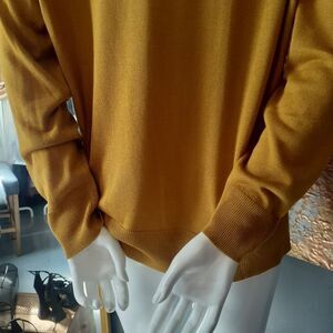 Stay cozy and stylish with this mustard yellow extra fine knit sweater from Zara Perfect for any casual outing and layering! Never worn, perfect condition, no flaws to note. Viscose/ Acrylic Blend with long sleeves and wide crew neck. Pullover style with stretch. Ribbed at cuffs and hemline. Small side vents as well. Size large, see flat lay measurements below!