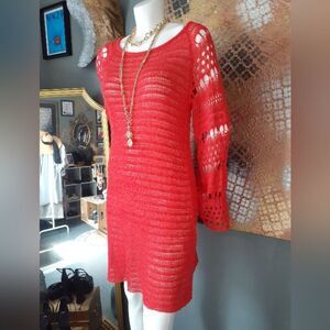 Elegant bright coral red knit a crocheted dress from Zara. Brand new, never worn perfect condition. perfect for any occasion. Features a stylish open-knit design with rounded boat neck and long voluminous trumpet style sleeves. This has stretch, see pics for full material composition. A line silhouette, pullover style. Size medium, see flat lay measurements below!