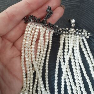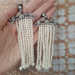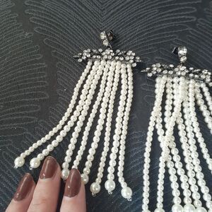 These stunning chandelier statement earrings feature cascading faux pearls (glass) and sparkling crystals, perfect for adding a touch of elegance to any outfit. From Zara and nwot, will come with Zara dustbag and wrapped with care! Butterfly backings with pewtertone metal. Not too heavy. See below for dimensions.