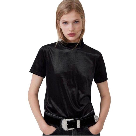 Zara Trafaluc Black Velvet Short Sleeve Mock Neck T-Shirt