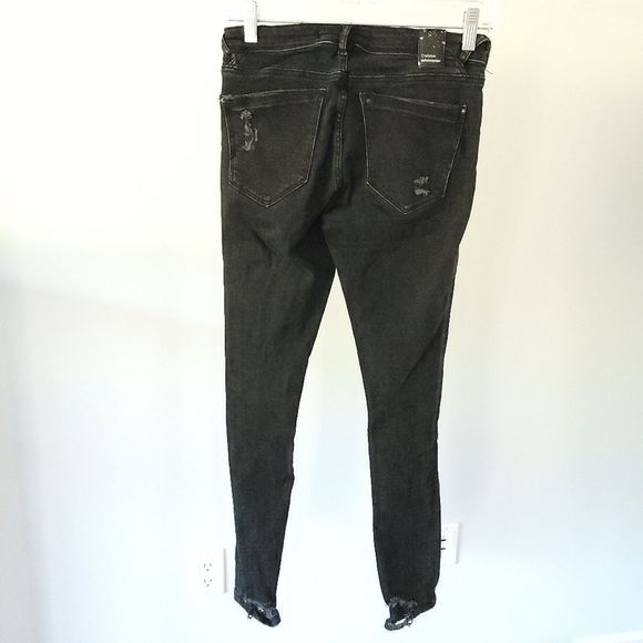 Black distressed front and back, skinny fit. Shirt zippers inside ankles. Zipper fly and button closure, Five-pocket style.
