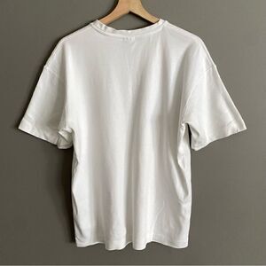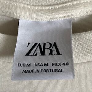 Picturing a white poly cotton blend colorful printed shirt with "injente" printin by Zara on a size medium.