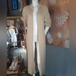 Step out in style with this elegant tan maxi cardigan from Zara. Perfect for any occasion, this piece offers both comfort and sophistication. 48% wool, see pics for material composition. Never worn, as I am allergic to wool. Openwork (buttonless) collar with wavy effect stitching. Mid tan in colour with long sleeves. Extra soft and cozy. There is some stretch as well. Label is xs/s. Perfect classic staple for fall. See flat lay measurements below!