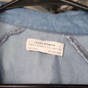 Stylish blue button-up shirt with ruffled sleeves. Perfect for casual or formal wear.