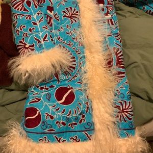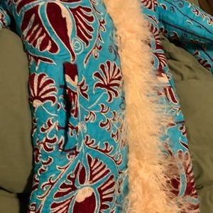This coat is an authentic Zazi Vintage coat made from upcycled sheepskin and vintage Suzani. This particular Suzani has beautiful burgundy coloured embroidery all over, which creates a nice contrast with the blue background. Because these coats are made from upcycled or vintage materials, they may have small marks or imperfections.