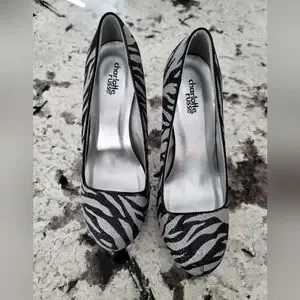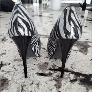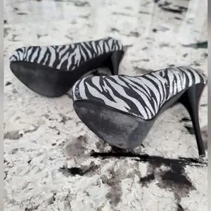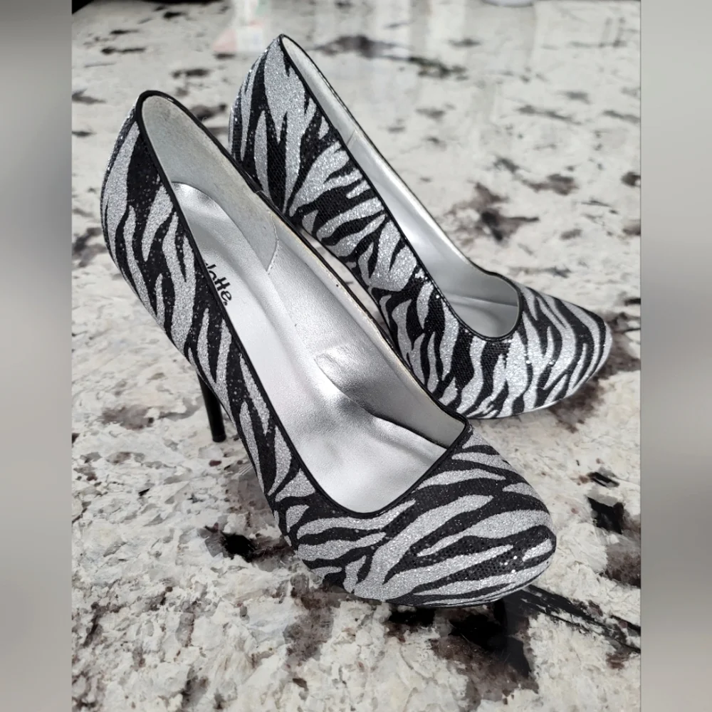 Charlotte Russe sparkly zebra patterned high heels. Never worn, only tried on. Size 8 but fit snug. Roughly 5 inches tall. Would be cute for a Halloween costume or with a little black dress 🖤
