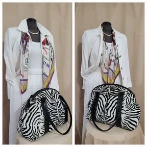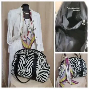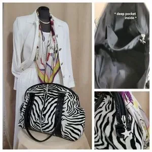 Stylish zebra print bag in heavyweight upholstery cotton /16 x 12 in high x 6 in wide/ nylon lining with deep zip pocket enside to hold wallet / phone / paperwork if traveling ( approx 12 x 12 in pocket)