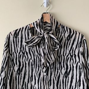 On trend tie neck blouse in zebra print. Button front, polyester wash and wear material. Perfect as office wear under a blazer.