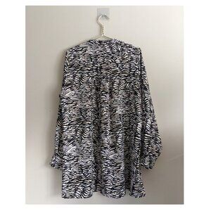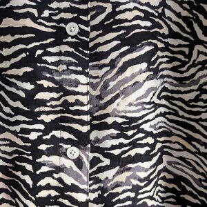 Long-sleeve zebra-print blouse. Not your usual stripes. This is a long-sleeve, button-front blouse with a band collar. It's made with a matte, satin-like fabric that drapes beautifully. The zebra print is exclusive to the brand. Curved hem. Box pleat at back adds volume. Content: 100% polyester