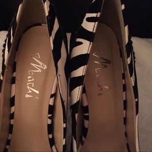Black and white zebra print platform pumps. Heels are approx 3". Have only worn 2-3 times. In excellent condition very comfortable pumps. Would make addition to Halloween costume.