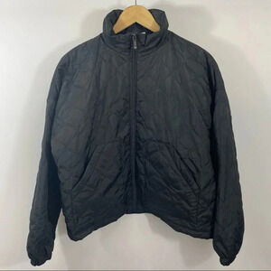 A cute, sporty and functional quilted bomber jacket from Zella. Black with diamond quilting for transitional season warmth. Zip closure, stand collar, side slant pockets. Elasticised cuffs. Drawcord adjustable waist. 100% recycled polyester.