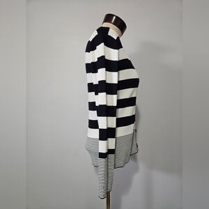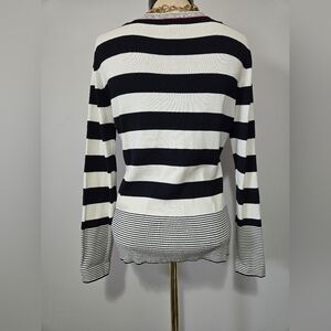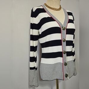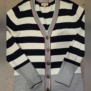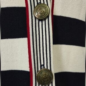 Nautical navy and white striped sweater with an ornate buttons up closure. V neck. Red piping.