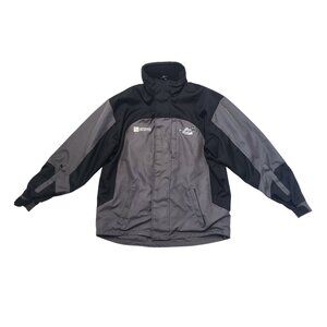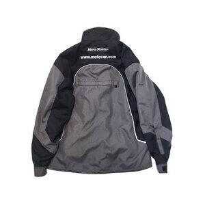 Zero Factor motorcycle riding jacket by Motovan, men's size L. Features black and gray color blocking, protective lining, front and back embroidered logos, multiple zippered pockets, and full inner mesh lining.
