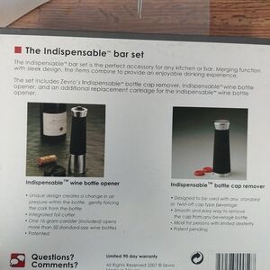 Zevro Wine Bottle Opener Bar Set. Perfect accessory for any kitchen or home bar. Function with sleek design. Includes bottle cap opener, wine bottle opener, plus replacement cartridge for the wine bottle opener. Makes an excellent gift for the holidays.