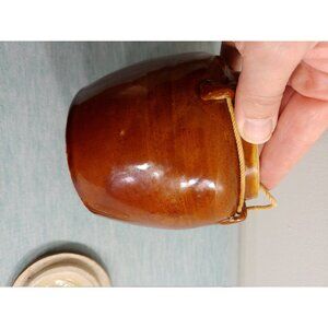 Vintage ceramic pottery jar, quite rustic and glazed in brown. The flat lid fits neatly onto the body but would need help of some twine to keep it into place. The body with 4 loops with a piece of string to tighten the lid or use as handles when loose. The flanks are marked in Chinese characters and the place name Zhejiangchina. These kind of jars are glazed on the inside and traditionally used as kitchen storage, for tea, ginger or pickles. Size: 4.5 inches tall