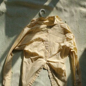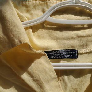 Strange light yellow cotton top with a button-up back and an angular front. Zoozy shop is the brand. No size but I would say Small.