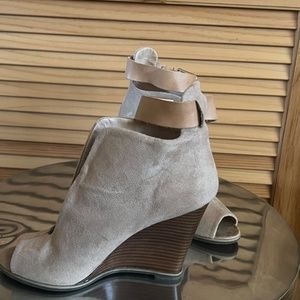 Stylish tan suede wedges. Open toe design. Adjustable ankle strap.