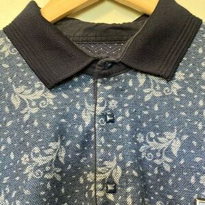 Stylish blue patterned long sleeve polo with a classic collar. Perfect for casual outings.