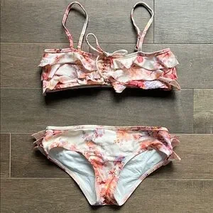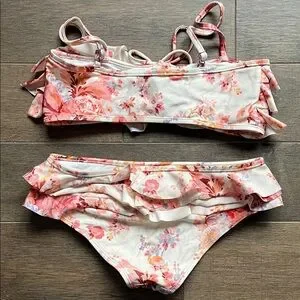 Two-piece bikini with layered ruffle bandeau top and matching bottoms. Warm cream base with floral print. Adjustable straps and front tie detail.