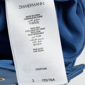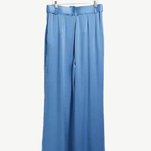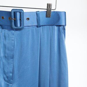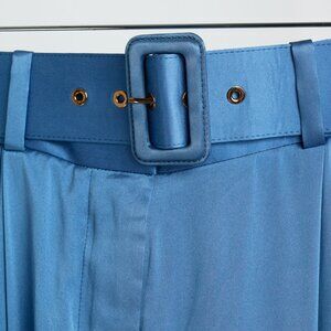 These pants from Zimmermann's 2024 Pre-Fall and Winter collection are crafted with a silk charmeuse in a Cornflower blue, and feature a high rise, a front double hook and zip fly closure, a belted waist with pleated detailing, belt loops, front slanted pockets, and wide-cut legs.