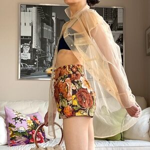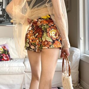 Zipper back closure. Unlined. High waist. Silver hardware: grommets for corset, ends of tie)100%linen. May fit XS/S(see measurements). Model is size Small, 5’9. Approx 12in length, 13in width at waist(smallest and has some room to open up)19in width at hips, 13in rise, 1.5in inseam, 12.5in width at leg hem.