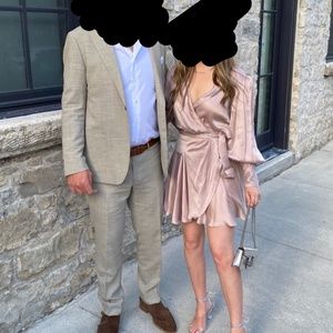 Worn once and it is in excellent condition! Beautiful and flattering. My pictures of the dress hanging on the back of a door make the colour look a bit darker. I would say it’s a light champagne blush colour in person. The last photo of me in the dress accurately reflects colour. Size 1.