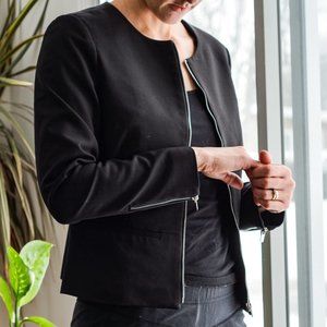 This size 4 top is a bit small for model 5'7" 120lbs B-breast, but looks nice if not zipped up.