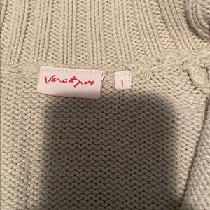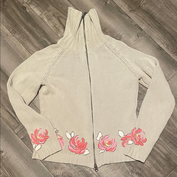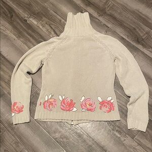 Adorable cotton sweater with flower detail. Two way zipper, ribbed collar and cuff.