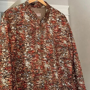 Pretty lined jacket/blazer. Colors of orange, charcoal, brown, white and blue. Lined. Long sleeves. Size 18. In immaculate condition.