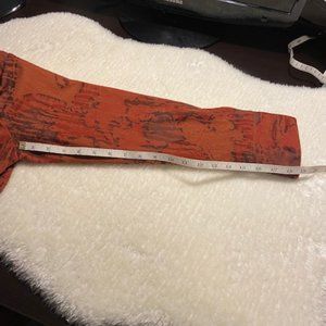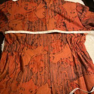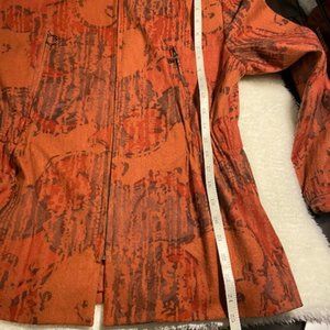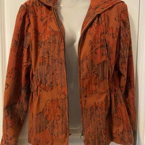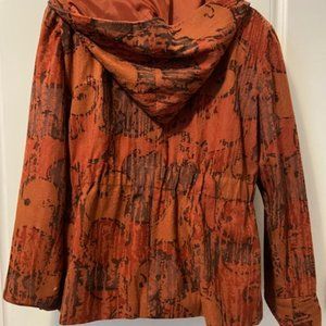 Rusty brown fall or spring jacket, ladies size small. Very lightweight and soft material. 65% Cotton with 35% Polyester blend. Zips up with hood and front zip pockets. Very good condition with no rips, tears or stains. Can be worn for a causual or dressy occasion.
