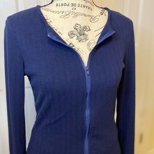 Navy blue set including long sleeve zip up top and mid thigh length biker shorts