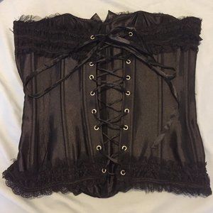 Black satin corset with side zip and lace-up back. Cute lacy fringe and a single bow up top.
