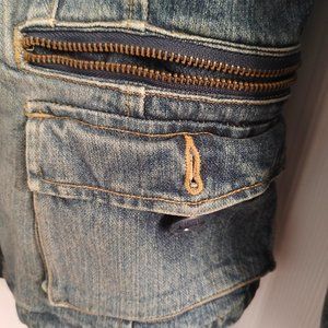 Beautifully faded jean jacket with zippers on the sleeves and multiple pockets.