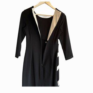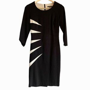 Keywords: minimalist, monochrome, elegant, sophisticated, modern, chic, contemporary, timeless, classic, clean-cut, structured, tailored, professional, formal, office-appropriate, workwear, corporate, business casual, power dressing, sharp, edgy, bold, graphic, geometric, angular, architectural, industrial, futuristic, avant-garde, high-fashion, luxury, designer, couture, high-end, premium, exclusive, limited edition, rare, collectible, pencil dress, sheath dress, bodycon dress, fitted dress, midi dress, knee-length dress, three-quarter sleeve dress, long sleeve dress, crew neckline, round neckline, black and white, contrast, striped, sunburst, ray pattern, geometric pattern, graphic design, architectural silhouette, structured bodice, fitted waist, flared skirt, A-line skirt, pencil skirt, slim fit, body-hugging, figure-flattering, hourglass shape, sexy, alluring, seductive, confident, powerful, commanding, power-core, corporate-core, office-core, workwear-core, professional-core, business-casual-core, witchcore, dark academia
