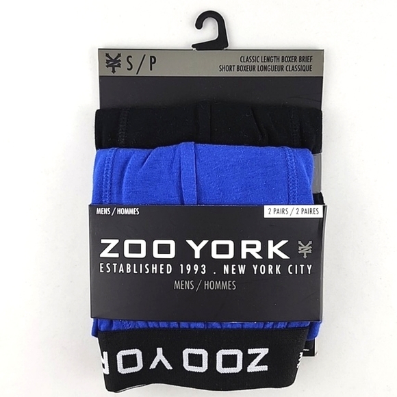 New with tags, Zoo York men's classic length boxer brief 2 pairs: 1 black, 1 blue 95% cotton / 5% spandex. Size small.