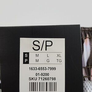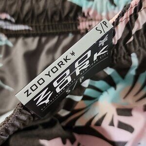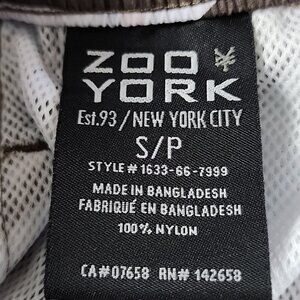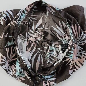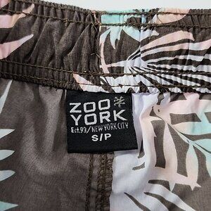 New with tags, Zoo York men's lightweight short in brown with all over tropical print with elasticized waistband and tie and two side slip pockets, size Small.