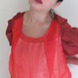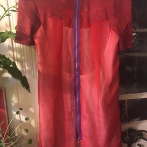 Very beautiful designer dress. Back has a long zip and is see through right down to the hips. It is made of orange chiffon and cotton underneath. One of a kind. Really beautiful