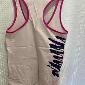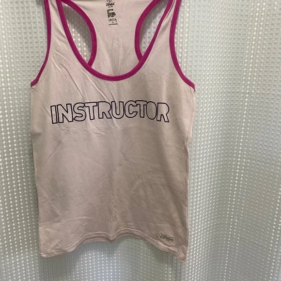 Blush colour Zumba racer tank top with pink edge and black writing. Size L