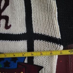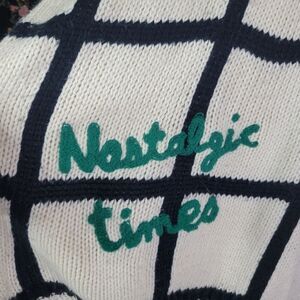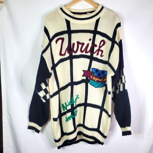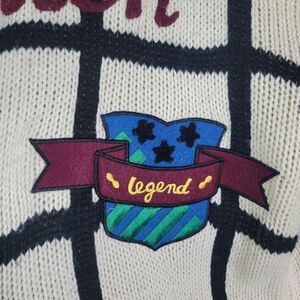 Old-money style heavy vintage university Preppy academia look sweater with stylish graphic bold fabric patches and bold lettering. Features a unique grid pattern. Ironic mash up design features. Comfortable and trendy. GUC