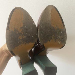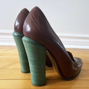 Pair of brown Fendi pumps with very high heels (12 cm). Verdigris laminated wooden heels. Condition: already worn, vintage.
