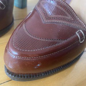 Paire de mocassins Fendi marron à très hauts talons (12 cm). Talons en bois stratifiés vert de gris. Etat : déjà portés, vintage.