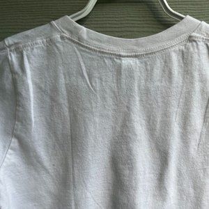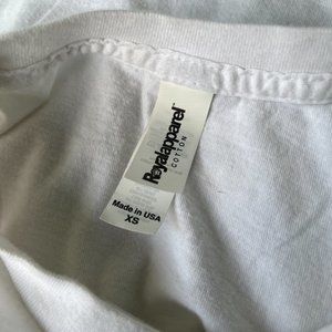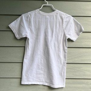 good used condition, size xs from AK press. white with black text. there are two hard to see yellow spots on the back of the shirt (see last picture)