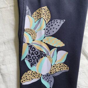 Stylish adidas leggings. Black with blue geometric waistband. Floral detail on leg.